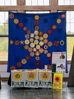 Nearly 80 fiber artists participated, including those from states other than New York. The tapestry was hung in the atrium of the Wild Center and caught the attention of all who entered. Over the summer, participating artists were tasked with visualizing and creating 10-inch circles representing the sun or earth. Contributors could knit, crochet, quilt or weave their circles by using suggested patterns, or their own imagination. Working alongside Michale Glennon, the Sun Day wool tapestry was assembled by a team of Third Act creatives in a studio in Woodstock New York.